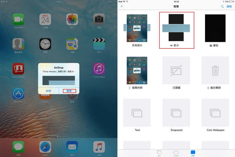 第 3 步 在 iPad 上收到提示後點擊「接受」,傳輸完成後你可以前往「照片」>「相簿」>「影片」中查看傳輸的影片了。